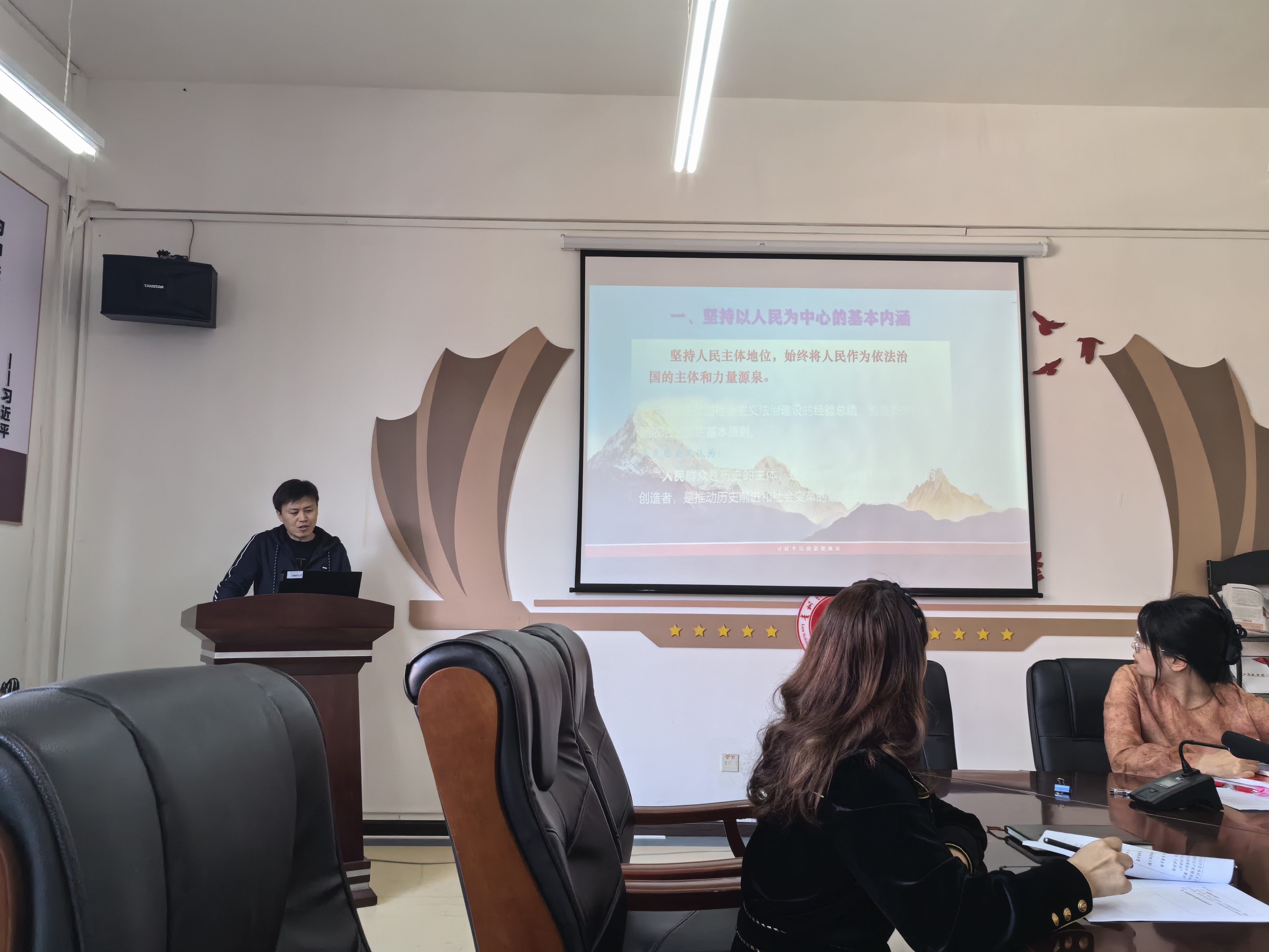 法学院党委委员、副院长宋昭澜,学生科科长郭雪,专任教师张凯在会上做专题研讨交流发言。教师何鹏做“习近平法治思想”专题辅导报告。