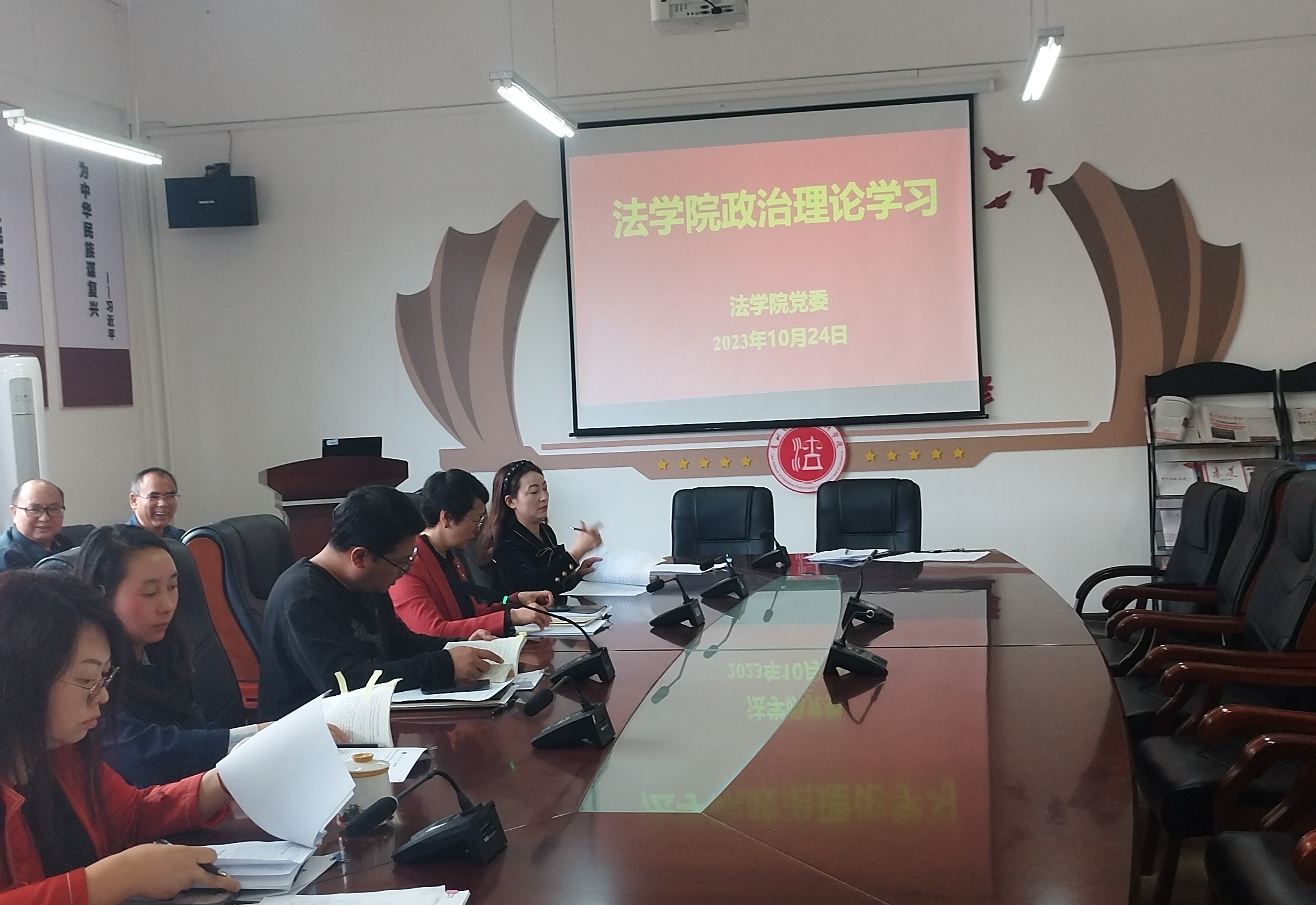 (法学院 张文友 报道|摄影 )10月24日,法学院党委组织召开2023年度第十五次教职工政治理论集体学习习近平法治思想与重要法规专题研讨会。院领导及全院教职工出席会议,院党委书记詹伟主持会议。