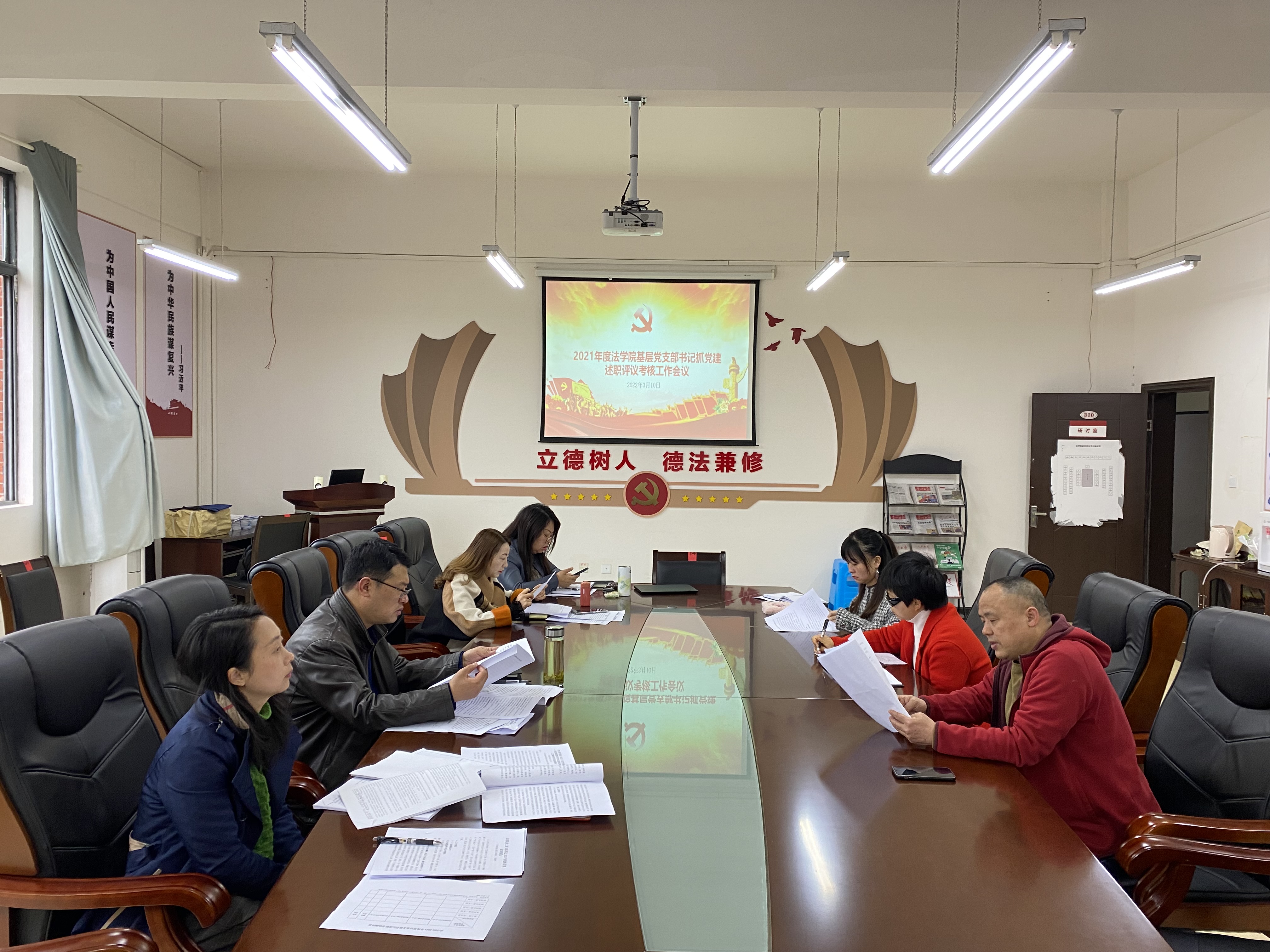 (法学院 图文/报道 向涛)3月10日上午,法学院在文德楼310会议室召开2021年度基层党支部书记抓党建述职评议考核工作会议,4个党支部书记现场述职,1个党支部书记书面述职。会议由院党委书记詹伟主持,全体党委委员,支部书记,部分党员代表参加会议及测评。