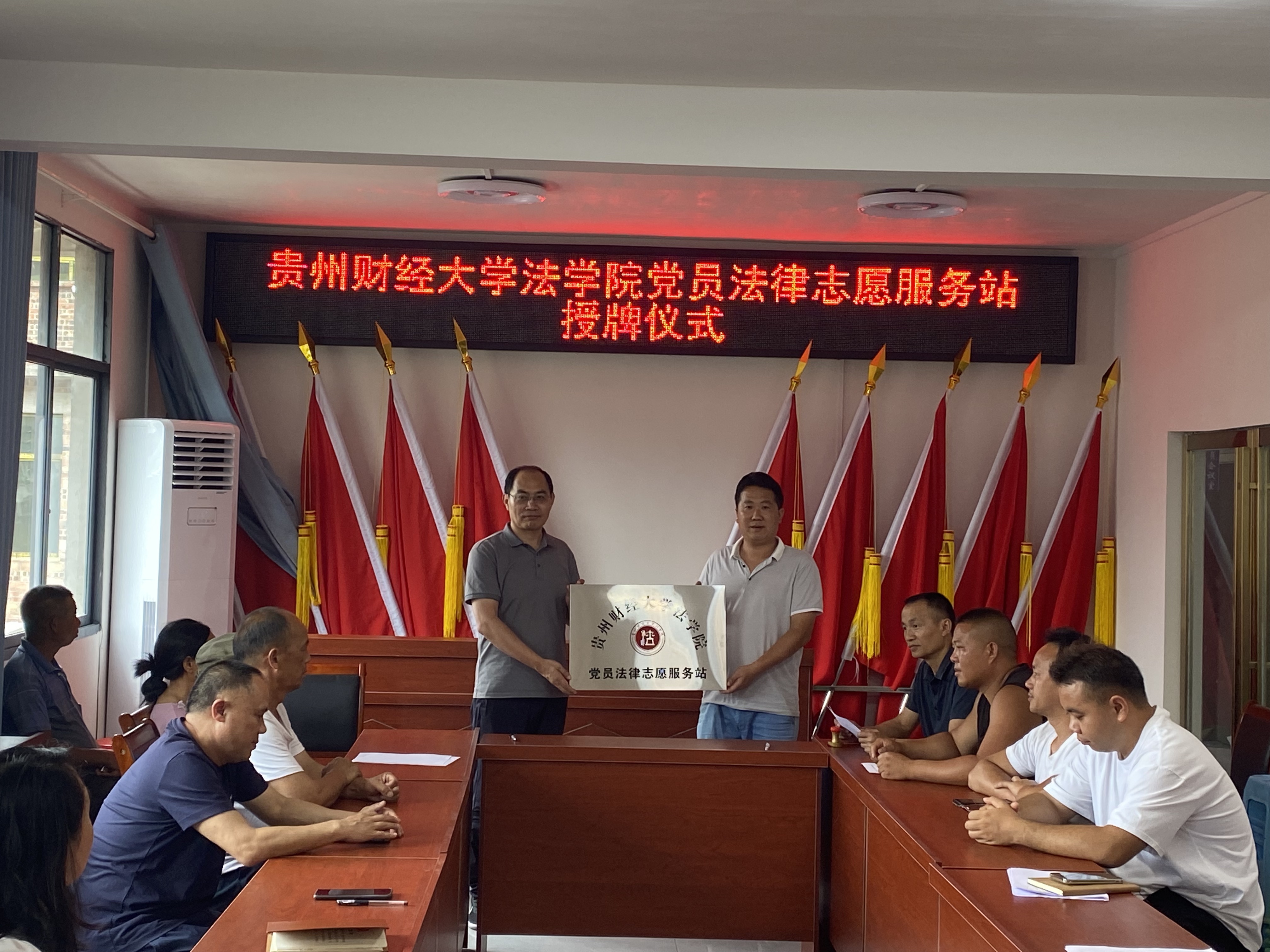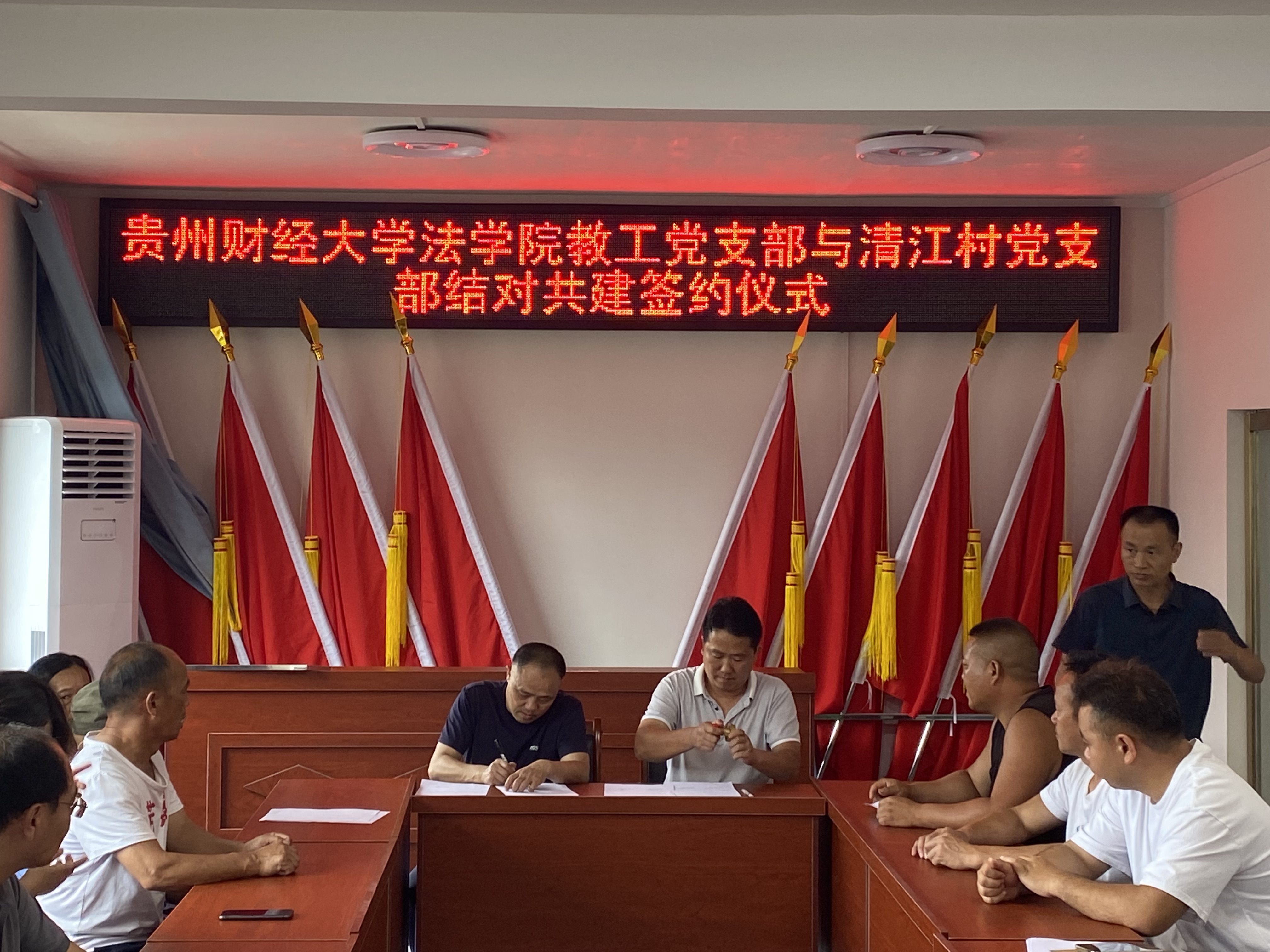 活动伊始,法学院党委与清江村村支两委、包括我院驻清江村第一书记李玉兰在内的驻村工作队开展座谈。清江村村支书陈世刚对法学院的到来表示欢迎,他介绍了清江村的村情民情等基本情况,希望法学院在民宿开发、苗族传统文化研学展销基地打造等方面给予支持。邵新顺表示将强化党建引领,与清江村党支部建立结对共建机制,发挥各自优势双向赋能,同时发挥法学院智力优势,为清江村的乡村振兴工作提供新思路、新方法。随后邵新顺与陈世刚共同为乐竞在线注册党员法律志愿服务站挂牌。曹务坤和陈世刚则围绕村民比较关心的婚姻家庭问题开展了题为《守护家庭权益 助力乡村振兴》的理论宣传二人讲,并现场回答了村民的相关困惑。曹务坤作为法学院教工第二党支部书记与陈世刚签署了党支部结对共建协议,两个支部将在支部建设、产业发展、法律援助与调解等方面开展合作。