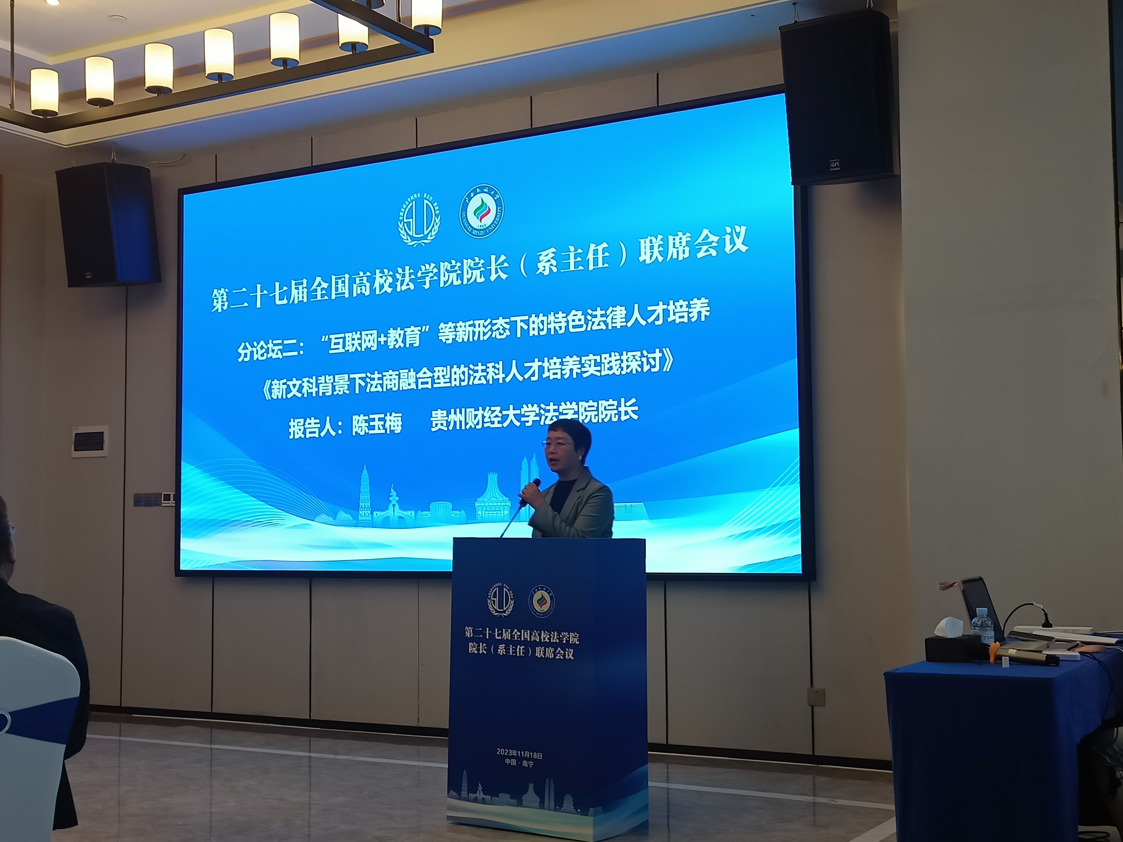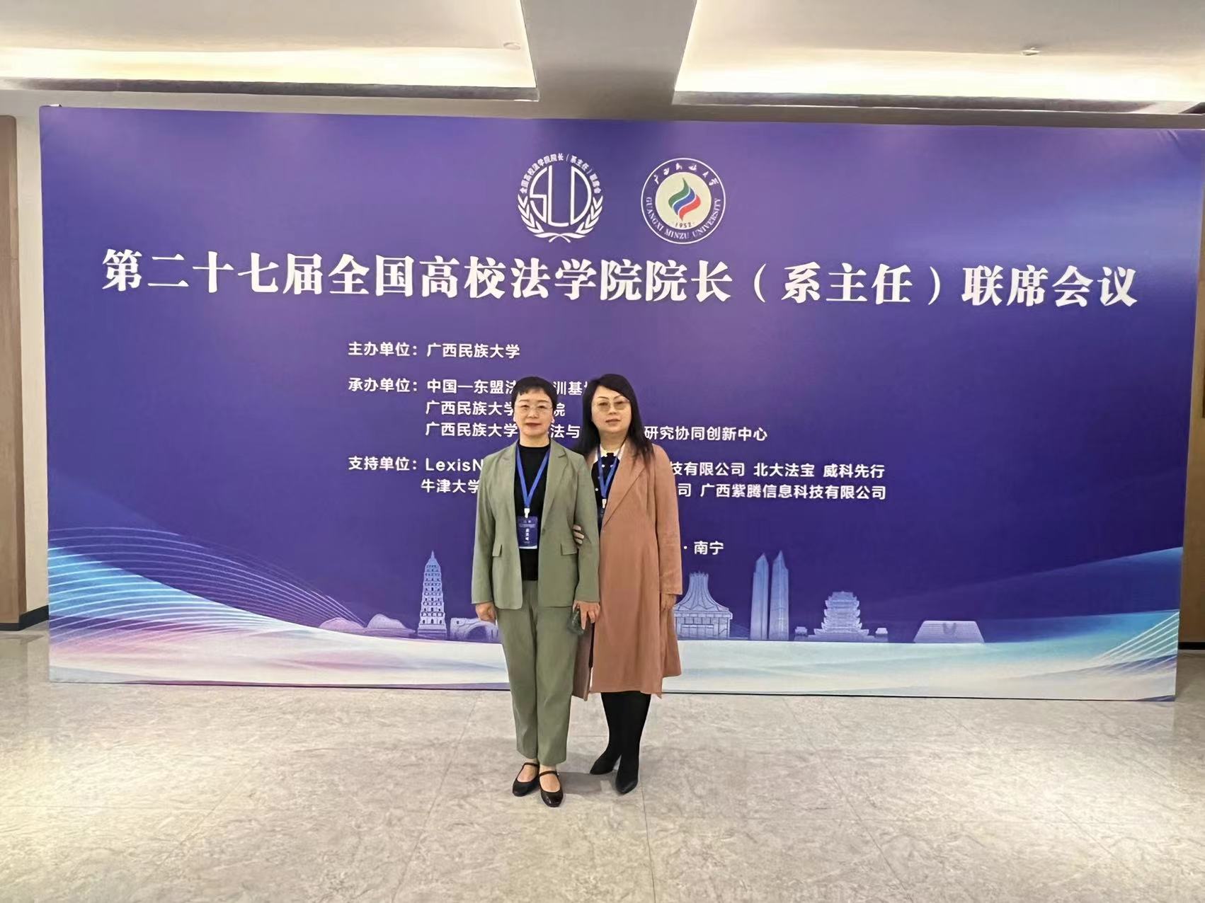 (法学院 图文/报道 宋昭澜)2023年11月18日,第二十七届全国高校法学院院长(系主任)联席会议在广西南宁召开。我院院长陈玉梅教授、副院长宋昭澜副教授受邀参会。本次联席会有来自中国人民大学、复旦大学、中南财经政法大学和兰州大学等100多所高校机构共200余名专家和代表参与。