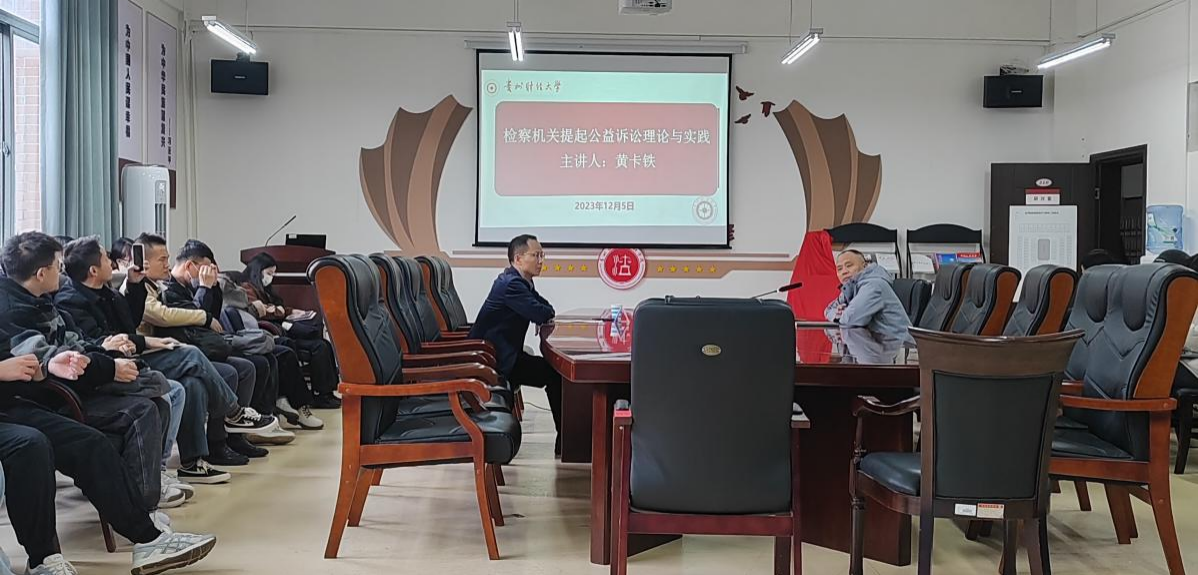 (法学院 图文/报道 韩琳)2023年12月5日下午,法学院在文德楼310会议室举办“检察机关提起公益诉讼理论与实践”的实务讲座。讲座由剑河县人民检察院党组书记、检察长黄卡铁主讲,法学院党委委员、副院长曹务坤主持,学院80余名研究生参加了讲座。