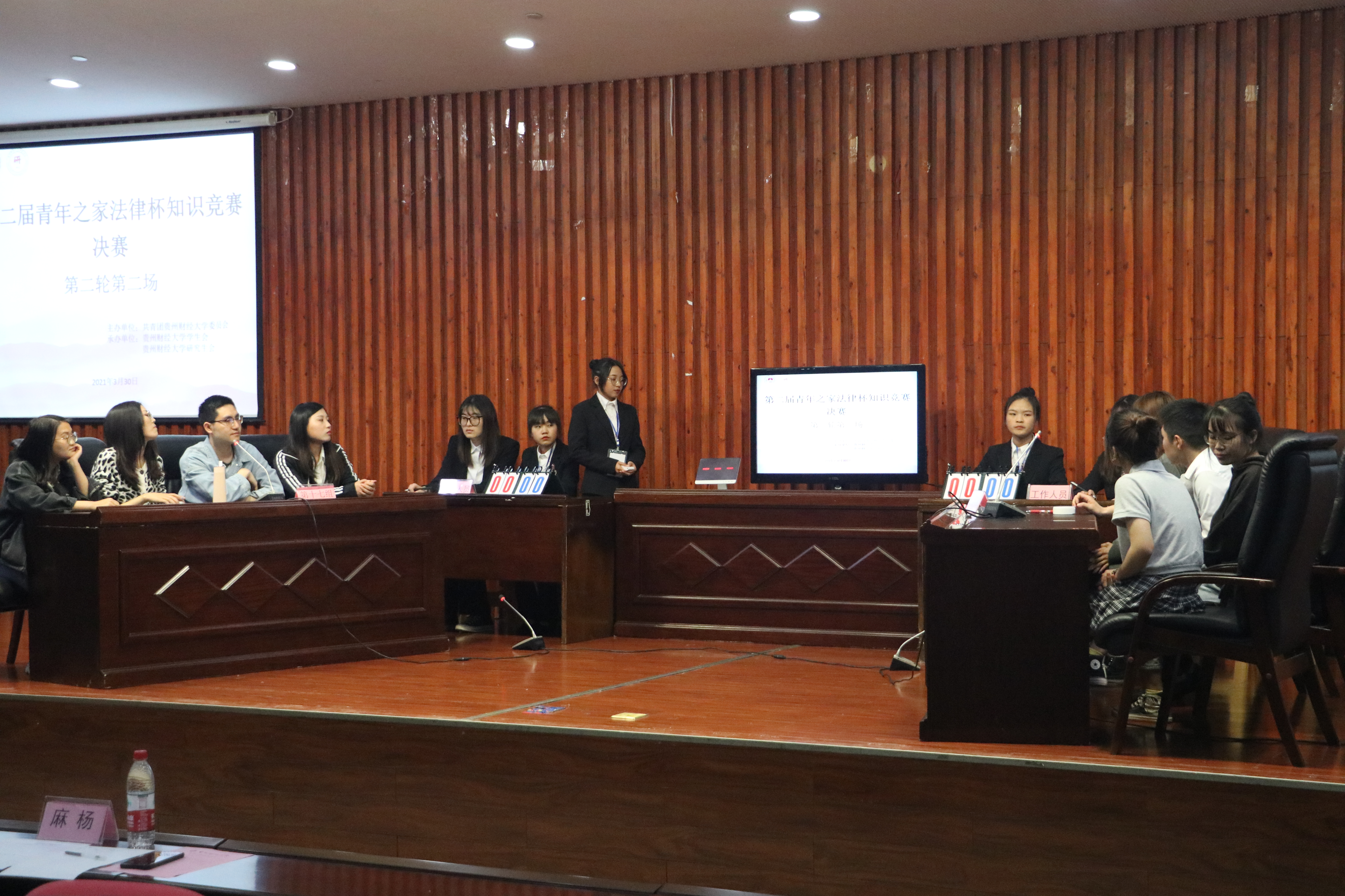 3月30日,为进一步弘扬法治精神,提升学生法律素养,在学生中树立知法、学法、懂法、守法、用法的意识,第二届"普及权益法律知识,共创法制校园环境"法律杯知识竞赛在花溪校区举行。本次活动由校团委主办,校学生会、研究生会承办,校团委副书记贾秋玲、经济学院副教授王艳、学工部老师张文良、校团委组织部麻杨参加活动。