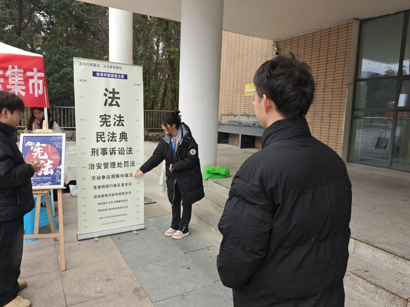 (法学院 徐露阳 报道|摄影 杨艳)值第十二个“国家宪法日”暨第八个“宪法宣传周”之际,为深入学习贯彻习近平法治思想,持续深化“普法+专业”育人模式,12月2日,贵州财经大学第三届“法律文化周”系列活动之“普法集市”活动在三食堂广场热闹开市。本次活动作为“法律文化周”系列活动的重要组成部分,以“法润校园,共筑和谐”为主题,创新设置8个特色“法律摊位”,吸引近500名师生参与,打造了一场沉浸式、互动式的法治文化盛宴。