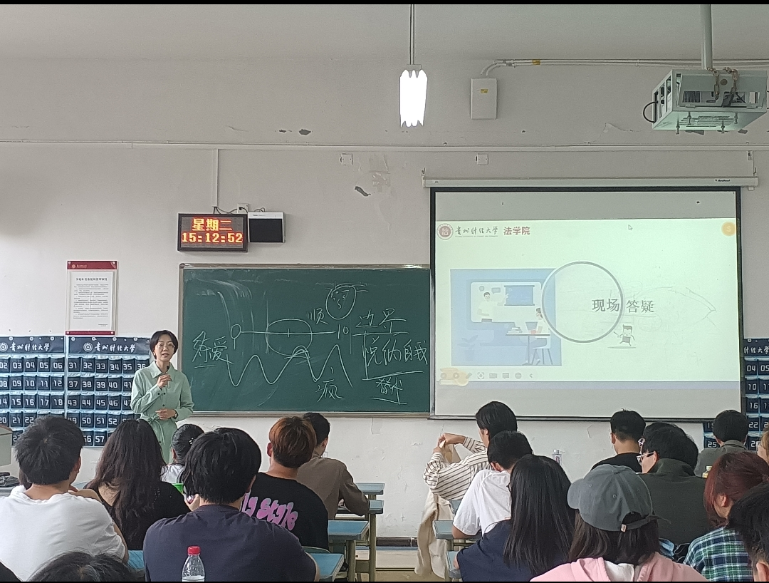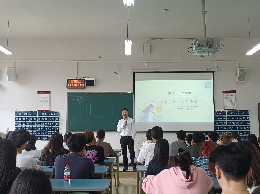 (法学院 张月娇 报道|摄影 罗慧)为进一步加强法学院大学生心理健康水平,提高学生心理调适能力,让学生能够以理性平和、健康积极的心态应对学习和生活中的挑战和困难。法学院邀请到国家二级心理咨询师、贵州大学心理健康教育咨询中心兼职心理咨询师曹浩副教授,于4月18日下午在博学楼2-19室为100余名同学开展题为《快乐青春,从心开始》大学生心理健康讲座。