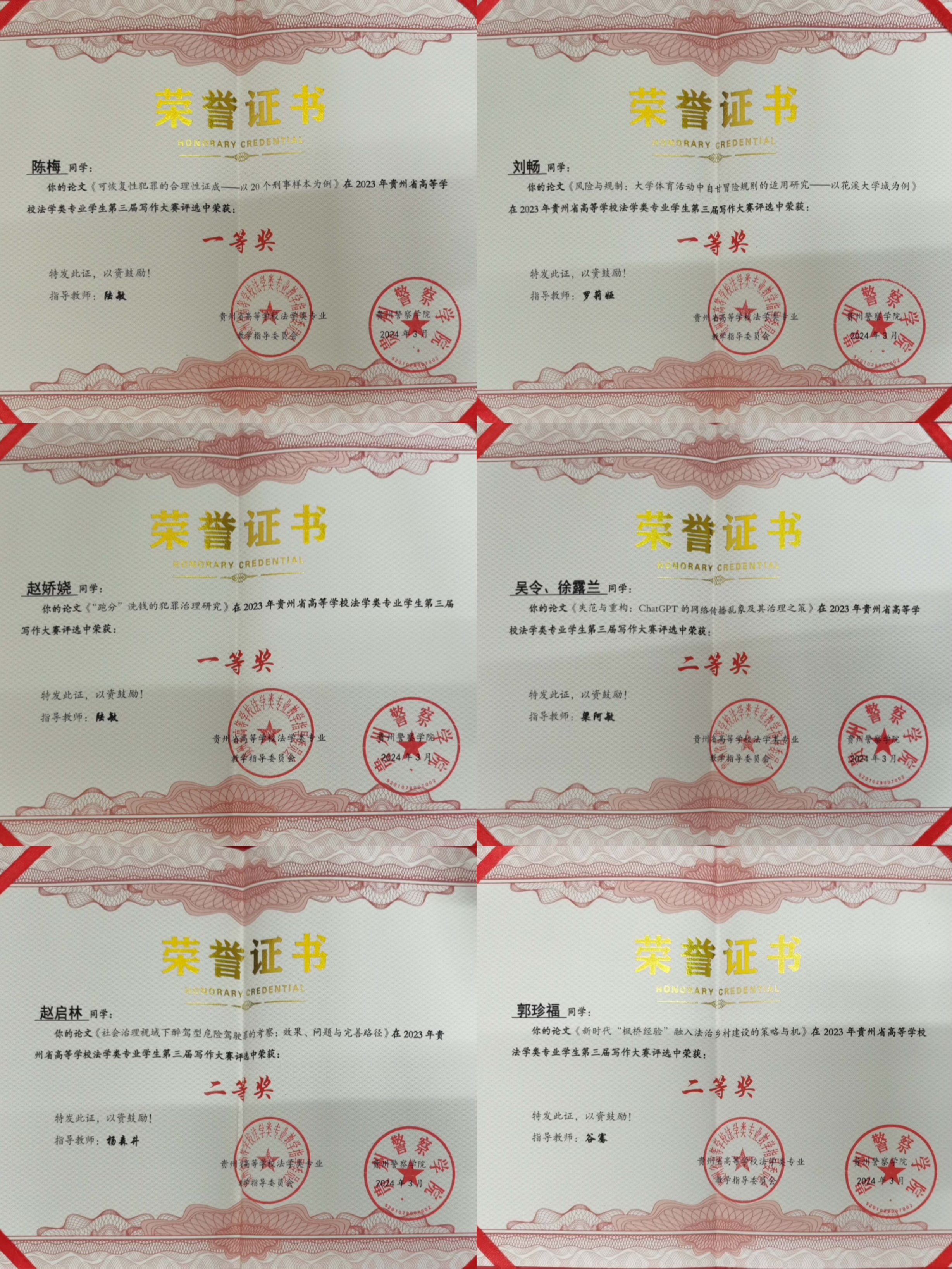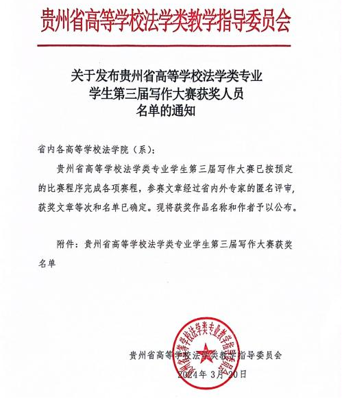 (法学院 图文/报道 陆敏)秉承乐竞在线注册“学术立校”理念,法学院鼓励老师积极指导学生参赛,近日,法学院本科生在2023年贵州省高等学校法学类专业学生第三届写作大赛中取得佳绩,共有20篇论文获奖。其中,一等奖3项、二等奖5项、三等奖5项、优秀奖7项,获奖论文数量在省内高校中排名第二,同时也是法学院本科生连续参加三届比赛以来取得的最佳成绩。