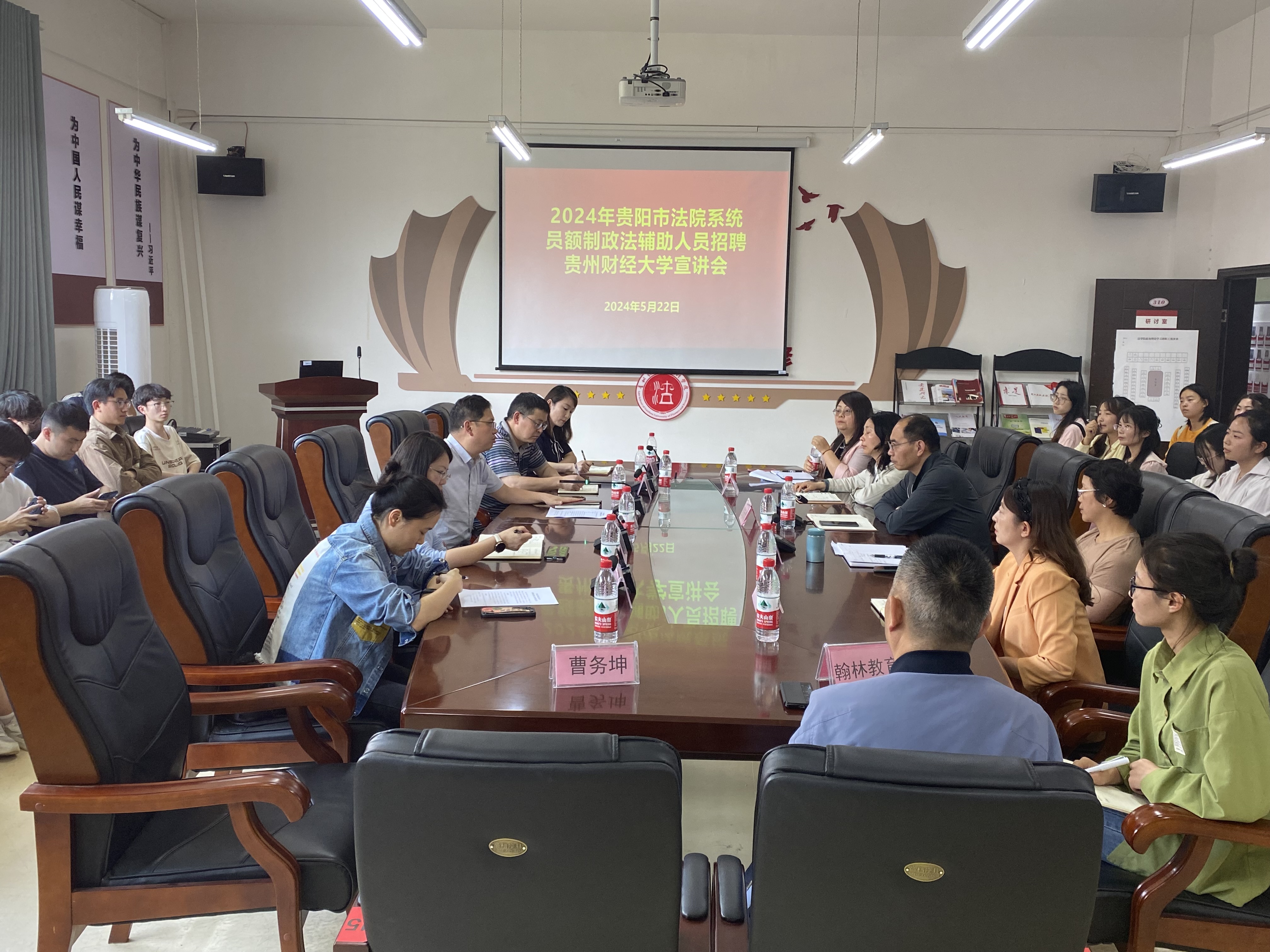 (法学院 图文/报道 刘美伶)为推动我院毕业生高质量就业,2024年5月22日,法学院召开2024年贵阳市法院系统员额制政法辅助人员招聘贵州财经大学宣讲会。贵阳市中级人民法院政治部主任严明,政治部人事处处长廖艳姝,政治部人事处余静,贵州财经大学招生就业处处长王志亮,副处长王茜,包括法学院党委书记邵新顺,院长陈玉梅在内的法学院全体领导班子成员出席活动现场。80余名毕业生参加了本次宣讲会。