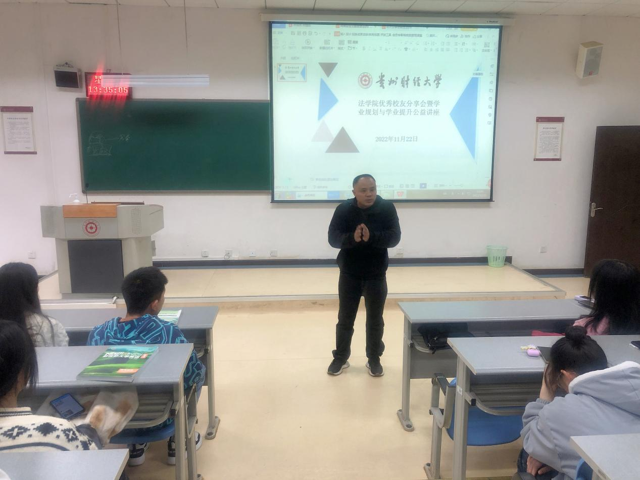 (法学院 图文/报道)2022年11月22日,乐竞在线注册22级本科新生在乐学楼参加了法学院组织的优秀校友分享会暨学业规划与提升公益讲座。讲座由法学院曹务坤副院长主持,我院优秀校友代表朱凤飞、罗飞、柴佳为同学们作了学业规划与提升的分享。
