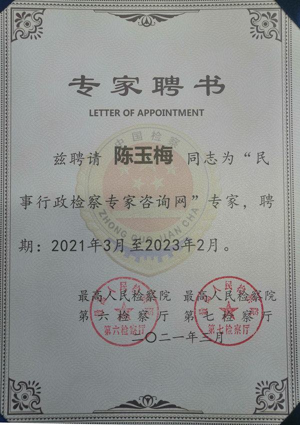 我院陈玉梅教授被最高人民检察院聘请为民行咨询专家