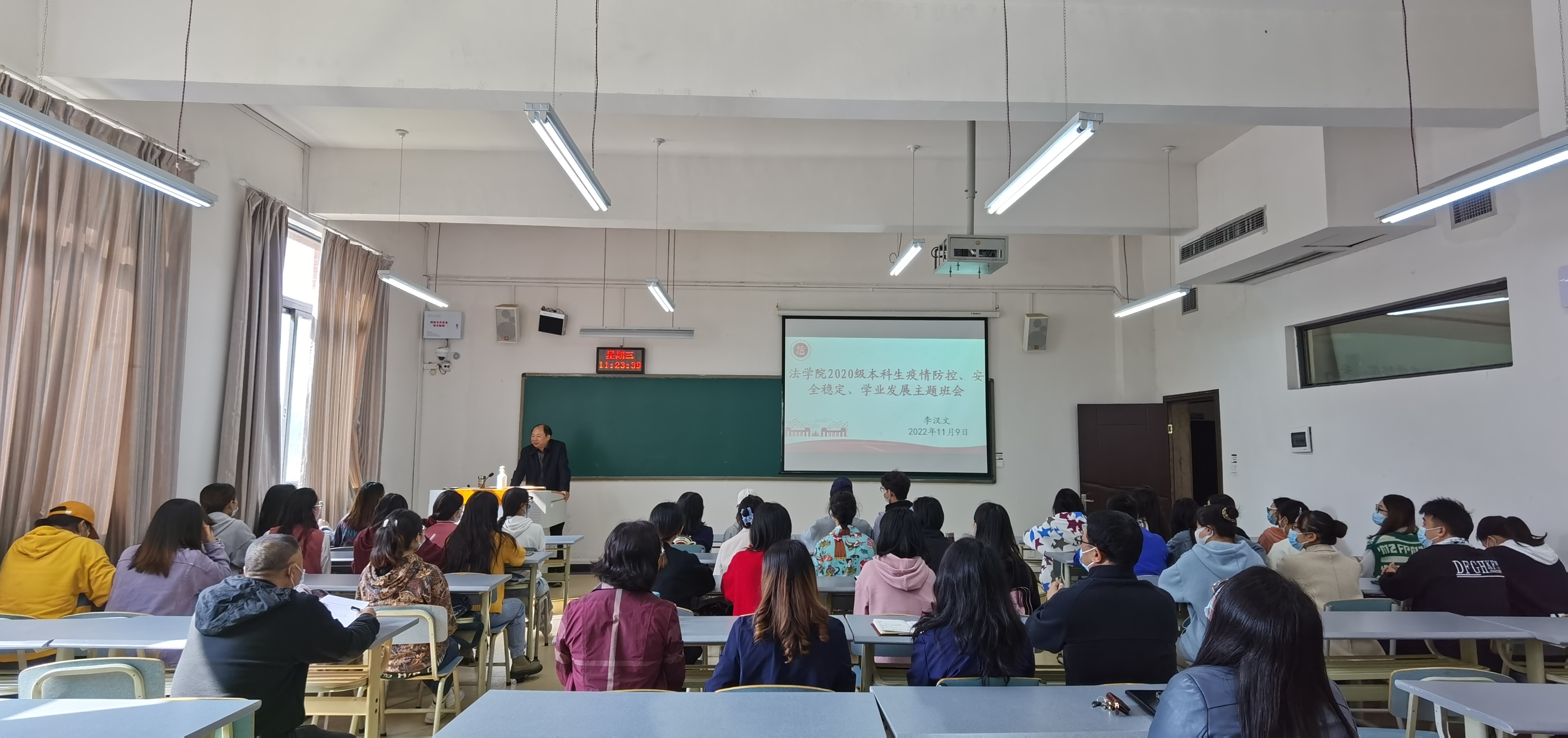 (法学院 米钰 报道/图片 杨珊)2022年11月9日中午,校党委委员、副校长李汉文到文德楼202教室与联系的法学院2020级法学(卓越人才计划)班本科生召开了主题班会,法学院党委书记詹伟,党委副书记、院长陈玉梅以及其他班子成员、辅导员参加班会。