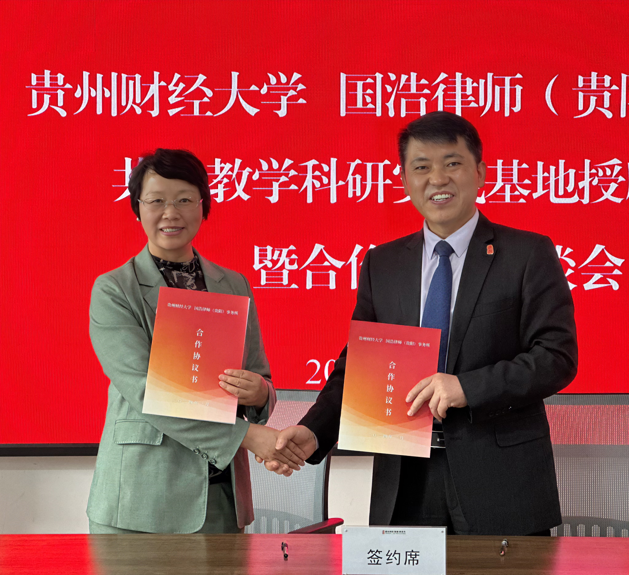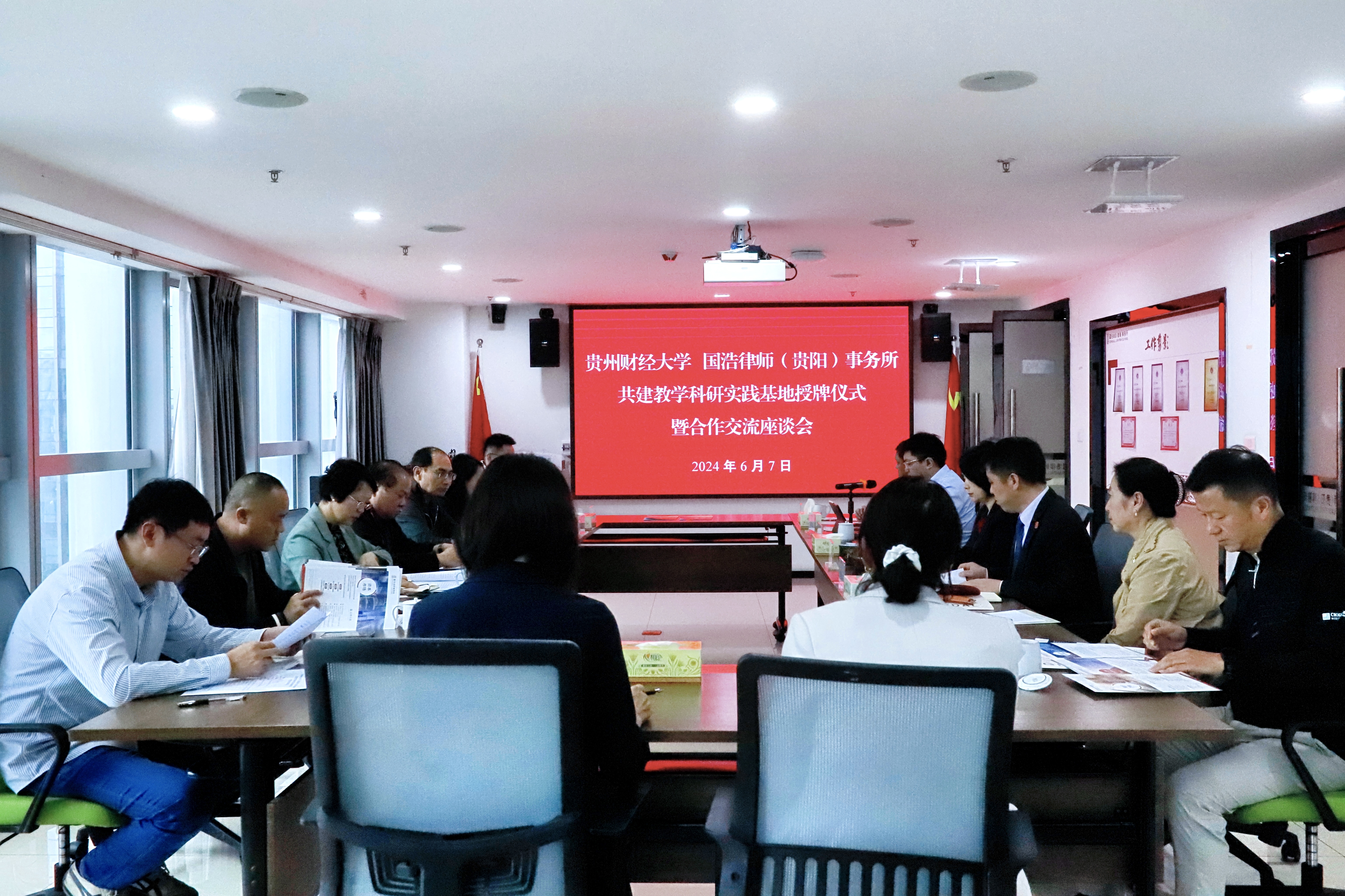(法学院 王霖 图文/报道)2024年6月8日下午,贵州财经大学特聘教授、贵州省社会科学院原党委书记吴大华;乐竞在线注册党委书记邵新顺,党委副书记、院长陈玉梅一行前往国浩律师(贵阳)事务所(以下简称为“国浩贵阳律所”),举行共建教学科研实践基地授牌仪式暨合作交流座谈会。贵州省律师协会会长、国浩贵阳律所合伙人白敏;国浩贵阳律所主任、管理合伙人郑世红,党支部书记、管理合伙人兰钢等人员出席会议。会议由国浩贵阳律所管理合伙人潘志成主持。双方就党建工作开展、法商融合型人才培养、科研合作创新、实践成果转换等问题进行了深入交流。