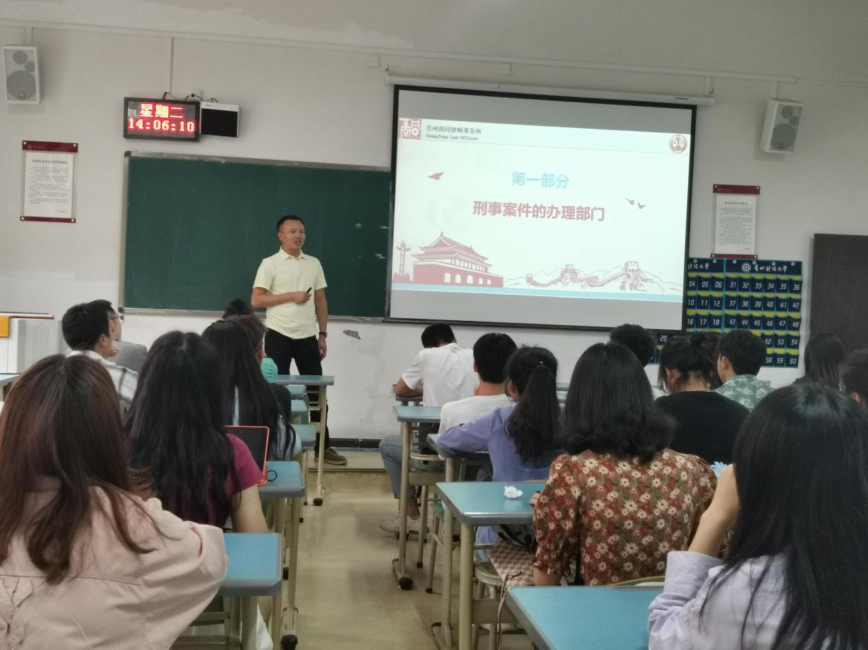法学院通过“师生座谈、为群众办实事”,了解到学生对于法律专业知识学习的需求外,急需法律实务相关知识的补充。为增强学生的法律实务相关知识,提高学生的法律实务水平,法学院于6月8日在博学楼1-10特邀贵州商同律师事务所合伙人王军(贵州省人民检察院专家咨询委员、贵阳市人民监督员、贵阳市人民检察院专家委员会委员、听证员)作“律师办理刑事案件中的策略与技巧”的专题讲座。讲座由何鹏老师主持,法学院研究生导师王霖和辅导员杨兴莉列席,我院60余名本科生和研究生参加。
